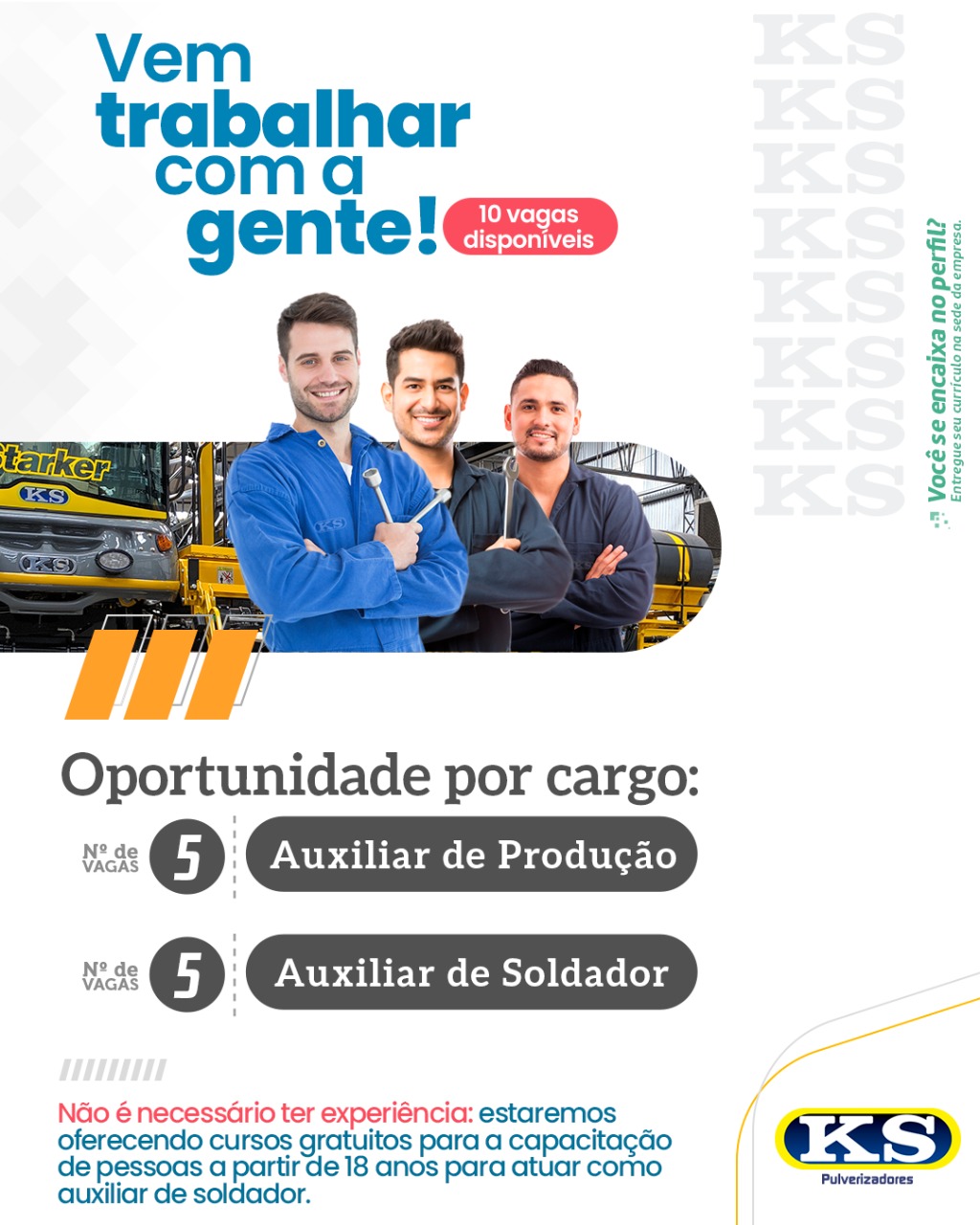 Com uma indústria em plena expansão, a KS Pulverizadores cresce de norte a sul do Brasil, com vendas até mesmo no exterior. Para suprir essa demanda e continuar crescendo, semanalmente, a empresa abre oportunidades de emprego em várias áreas. Para conferir as vagas, acesse a página da KS Pulverizadores no Facebook (clique aqui) e veja.